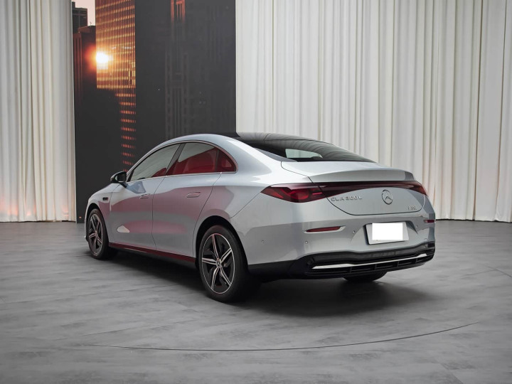 再来看车身侧面部分,车身侧面是北京奔驰 CLA EV 的 “中国定制核心区”。4763×1856×1469 毫米的尺寸与 2830 毫米轴距,相比标轴版多出的 40 毫米全部服务于后排空间,同时通过 “上扬式腰线 + 内凹曲面” 的设计,让车身在视觉上依旧保持轿跑的紧致姿态。这条从翼子板贯穿至尾灯的腰线,在光影下形成肌肉般的张力,而隐藏式电动门把手关门后与车身无缝融合,可减少风阻系数,同时,车身提供曜岩黑、松雾青等 5 款中国市场特调色,其中松雾青采用云母颗粒喷涂工艺,在阳光下呈现细腻的珠光质感,精准命中年轻用户的审美需求。