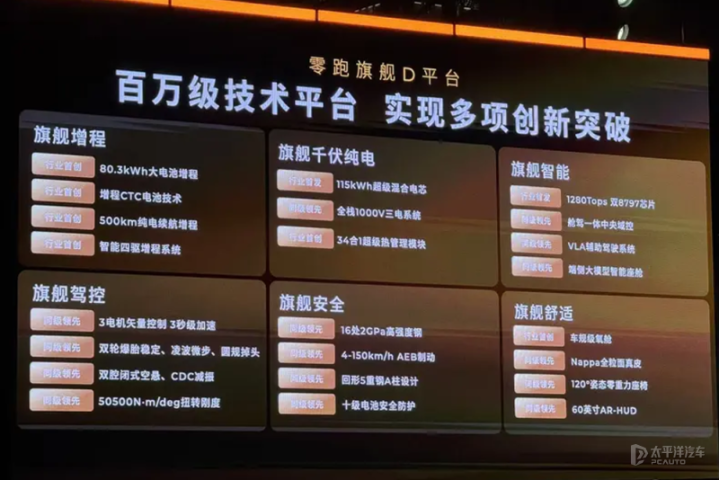 零跑D19基于零跑旗舰D平台打造,该平台历经十年技术沉淀,零跑在新能源整车架构、电子电气架构、电池系统、电驱系统、智能座舱系统、辅助驾驶系统等方面均实现自研。此外,新车零部件来自全球一流合作伙伴,包括宁德时代电芯、采埃孚发电机、博世孔辉双腔空悬、高通芯片、米其林轮胎等。
